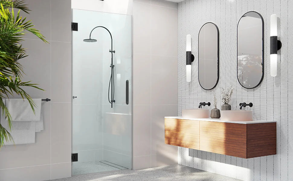 Perfectly blends contemporary trends with minimalist elegance. It features frameless, hinged shower doors that swing open with an ease. With simplistic clamps and a wide-opening design, these doors offer an unobstructed, crystal-clear view of your beautiful bath space.