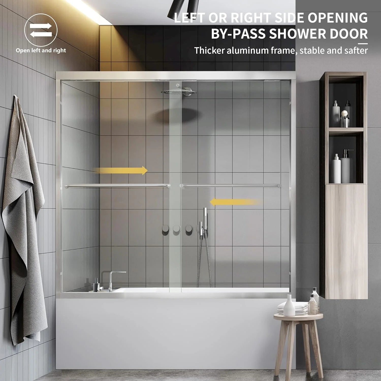 These beautifully designed bathtub doors measure a versatile 56"-60" in width and has a variety of height options, making them perfect for a range of tub sizes. Crafted from durable 1/4" thick tempered glass and framed with high-grade aluminum profiles, these sliding doors offer both style and functionality. The smart, space-saving design features a by-pass door that slides smoothly, whether you're opening it from the left or right. To complete the experience, an integrated towel bar keeps your bath towel within easy reach, making your post-bath ritual all the more convenient.