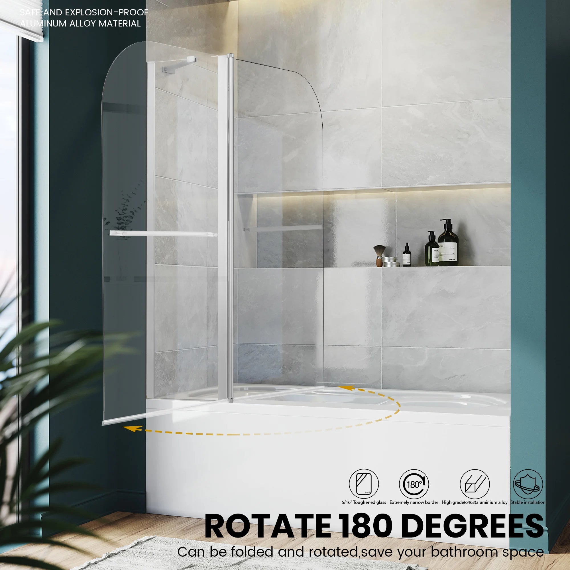 43" W x 58" H Frameless Pivot Foldable Bathtub Door with Curved Top, 1/4" (6 mm) Clear Tempered Glass, Towel Bar, 180° Pivoting