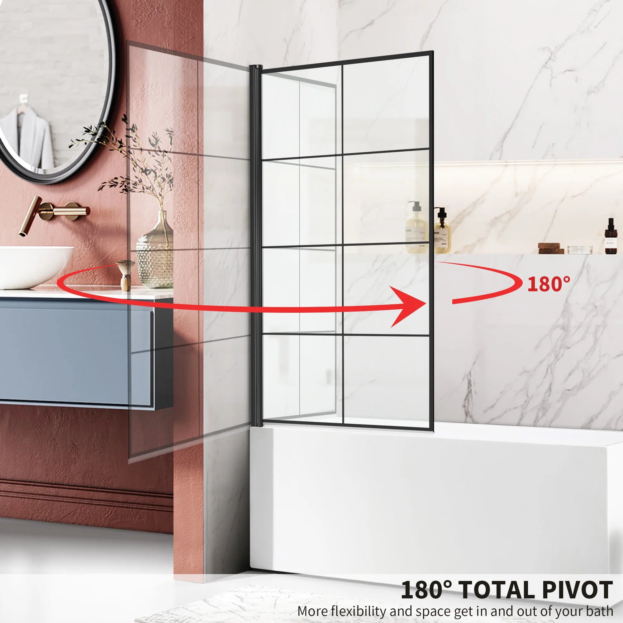 34" W x 58" H Pivot Framed Bathtub Screen with 1/4" (6 mm) Clear Tempered Glass, 180° Pivoting, and Matte Black Grid Design