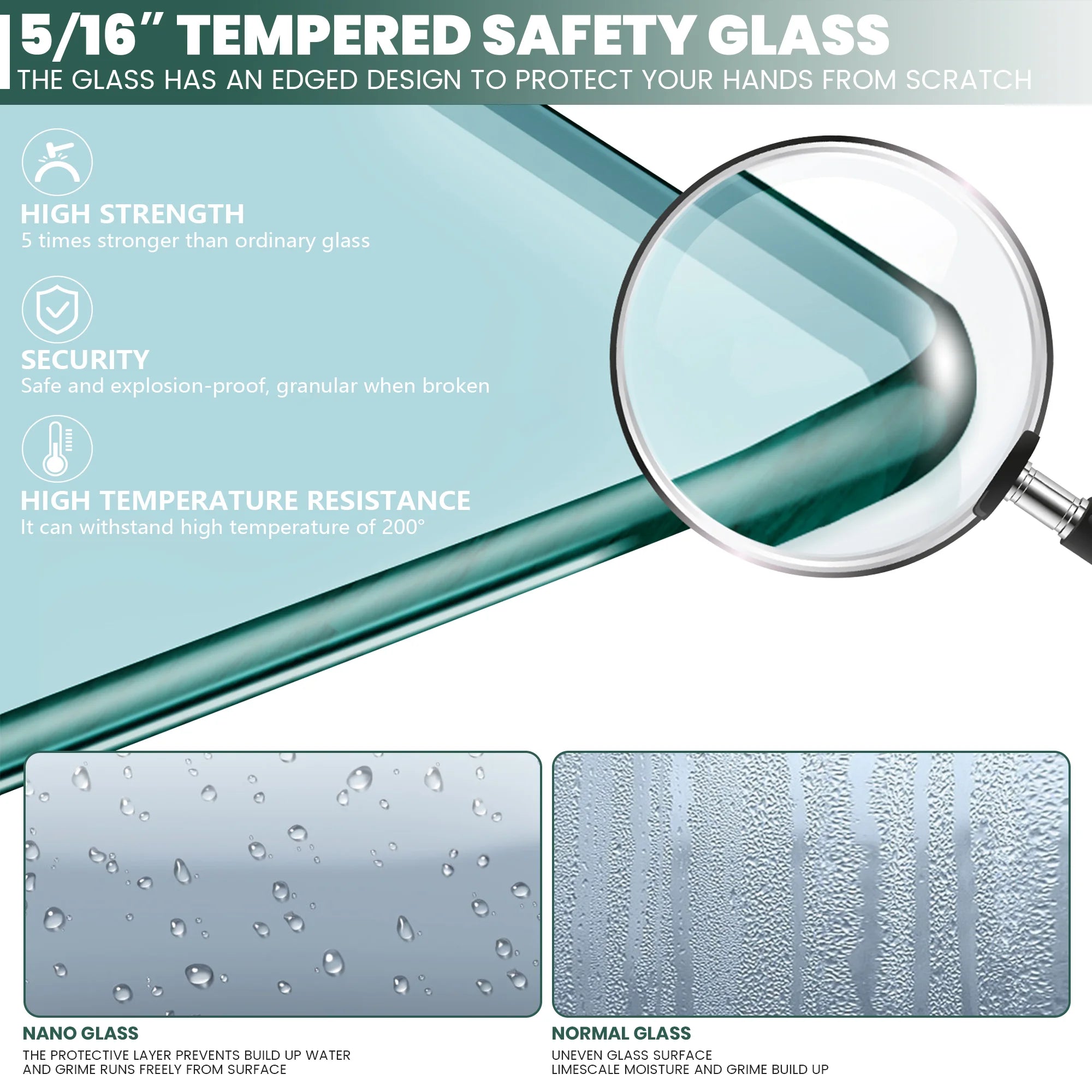 Resilient by Design: Corrosion-resistant hardware and 5/16 inch (8mm) thick glass ensure longevity and aesthetic appeal.